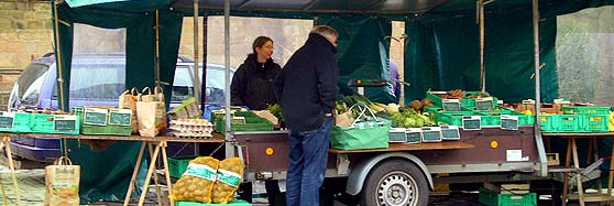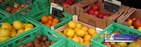 Dort verkaufen wir eigenes Gemüse der Jahreszeit (Salate, Tomaten, Gurken, Zucchini, Möhren, Pastinaken, Rote Bete, Bohnen, Zuckerschoten, etc.) und Zukauf von Biokollegen der Region, z. B. Kohl, Zwiebeln und Porree. Die Äpfel stammen vom Obsthof Augustin im Alten Land, Erdbeeren von Raimund Bäumer aus Tecklenburg, Südfrüchte von biosybaris aus Italien und Bananen aus der Dominikanischen Republik. Außerdem bieten wir Kartoffeln aus eigenem Anbau und unsere Eier von freilaufenden Hühnern an.